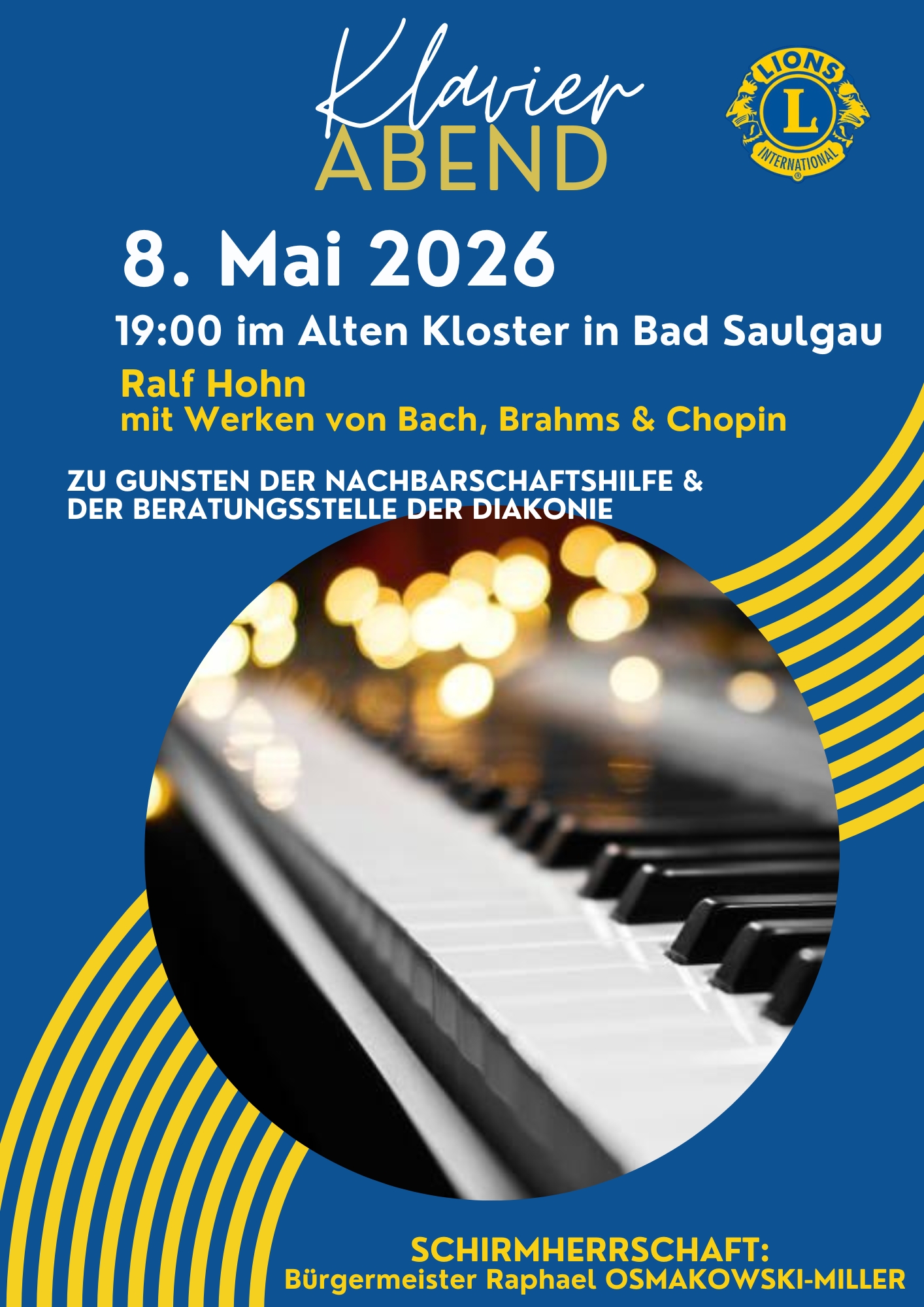 Unter der Schirmherrschaft von Bürgermeister Raphael Osmakowski-Miller erwartet die Gäste ein stimmungsvoller Abend mit Klaviermusik, Fingerfood und Getränken in besonderer Atmosphäre. Am Flügel spielt LIONS Präsident Ralf Hohn Werke von Johann Sebastian Bach, Frédéric Chopin und Johannes Brahms.